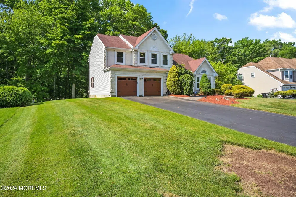 Discover this 4-bedroom, 2.5-bath colonial home on almost 1 acre in the highly desirable Southfield Estates of Manalapan township. The inviting double door entry opens to a grand 2-story foyer and adjacent living room with vaulted ceilings. Entertain in the formal dining room or relax in the dramatic open loft overlooking the living room. The kitchen boasts stainless steel appliances, a tiled backsplash, and a spacious eat-in area. Enjoy the family room with laminate hardwood flooring and a cozy wood-burning fireplace. The first level also features a home office/den. Retreat to the primary bedroom with laminate flooring, a walk-in closet, and an ensuite bath with a double sink vanity, stall shower, soaking tub, and skylight. Three additional spacious bedrooms offer ample closet space. The updated main bath includes a custom double sink vanity and ceramic wood-style tile. A versatile loft area on the second level and a full basement with a poured concrete foundation provide additional living and storage space. The private backyard is perfect for relaxation, With close to an acre of property their is enough room for a pool and the location offers convenient access to shopping and NYC transportation within minutes