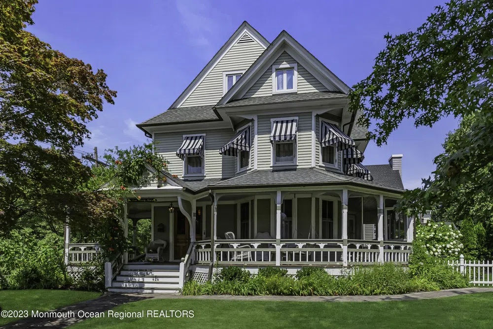 Lovely seashore colonial. 1st lvl features spacious liv & fam rms w/a masonry fireplace, formal din rm, butler's pantry, eat-in kit w/custom cabinetry, granite counters & SS appliances, mud rm w/custom build-ins & powder rm. 2nd lvl has 3 BRs & 2 bths, incl a private mst suite w/bth, sitting rm & fireplace, 3rd lvl has 3 BRs & full bth. (2 BRs no closets). Pine HW fls, intricate millwork & built-ins throughout, hw heat, 2 zone a/c, most rooms & ext trim freshly painted, full basement, an expansive wraparound porch connected to a large rear deck, a private property w/lush mature landscape. 4 blocks from the beach, boardwalk & town shopping.