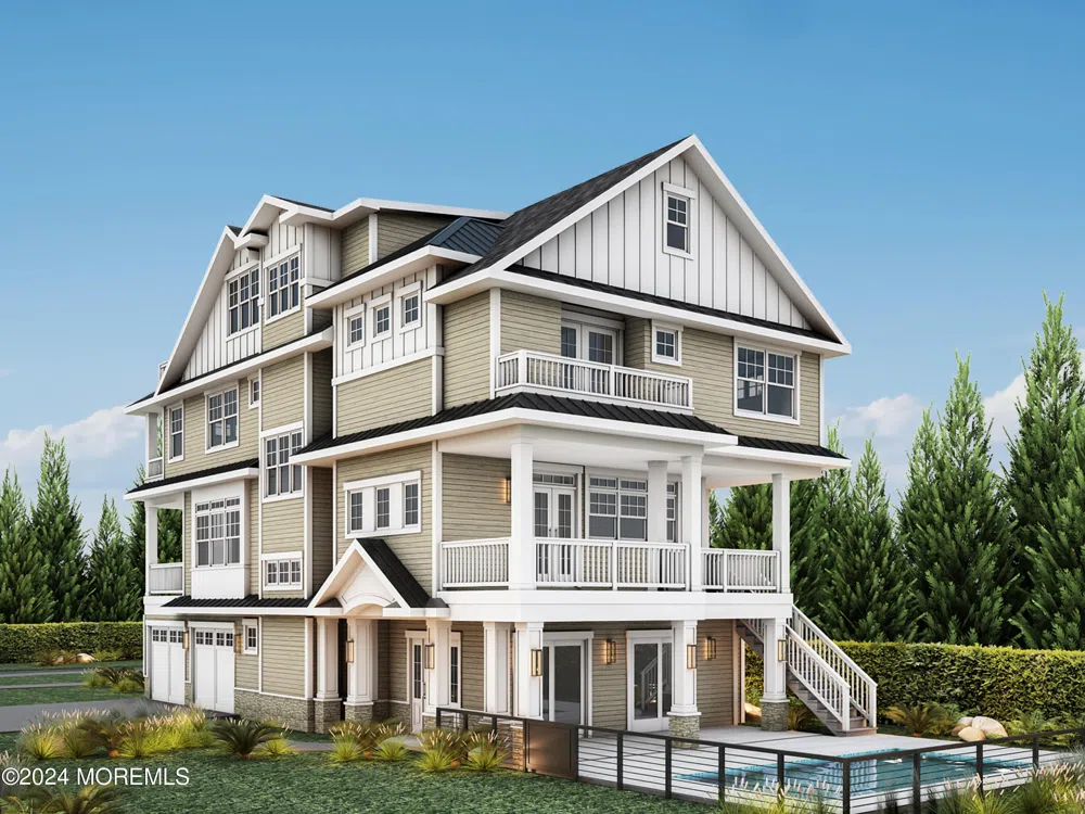 To be built custom designed 4/5 bedroom, 4.5 bath Shore Colonial is in the desirable Journey's End section of Normandy Beach. The 1st level has an open floor plan comprised of living room w/gas fireplace, dining area, custom kitchen w/quartz center island & butler's pantry, laundry room, half bath, & 2 covered balconies with water views. The 2nd level has a primary bedroom w/full bath & private balcony, 3 additional bedrooms one with an ensuite bath, & a hallway bath. The 3rd floor rec room includes a full bath & large balcony w/great bay views. Additional features include 4 stop elevator, pre-wired interior & exterior speakers, hardwood floors, & upgraded finishes. The exterior features an in-ground, heated, salt-water pool, paver patio backyard, & 2 car garage.